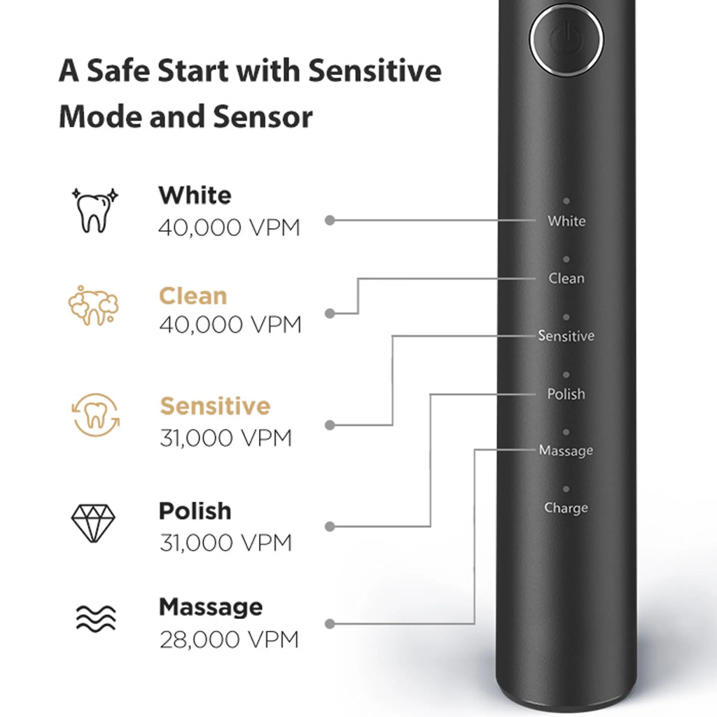 Clean (متوسط) : حالت استاندارد برای تمیز کردن روزانه دهان (دارای ۴۰۰۰۰ ضربه برای تمیز کردن کامل است.) Sensitive (ملایم) : حالت سرعت کمتر برای لثه های حساس (دارای ۳۲۰۰۰ لرزش در دقیقه است که برای افرادی که برای اولین بار از مسواک برقی استفاده می کنند.) Polish : فرکانس معکوس برای پولیش دندان جلو Massage : فرکانس معکوس برای لثه های دردناک یا ملتهب |